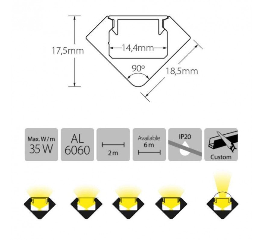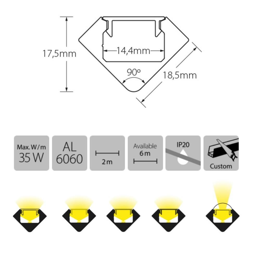 Perfil de superficie sin difusor. Fabricado con aluminio extrusionado y anodizado. Diseñado como disipador de tiras LED.