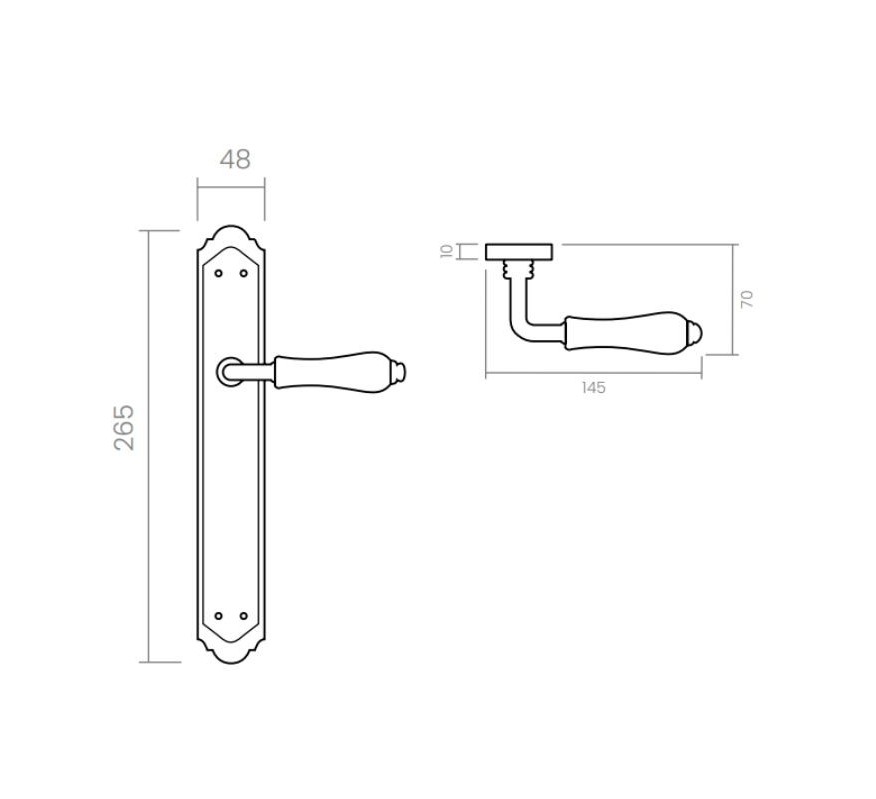 Esta manilla, fabricada en latón estampado y con empuñadura de porcelana, incorpora la técnica del 'craquelé': un acabado que imita las finas grietas que aparecen con el paso del tiempo en las obras de arte, aportando un toque de elegancia envejecida y carácter único a la pieza."