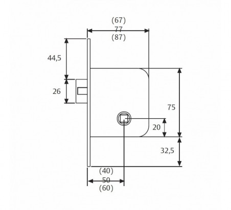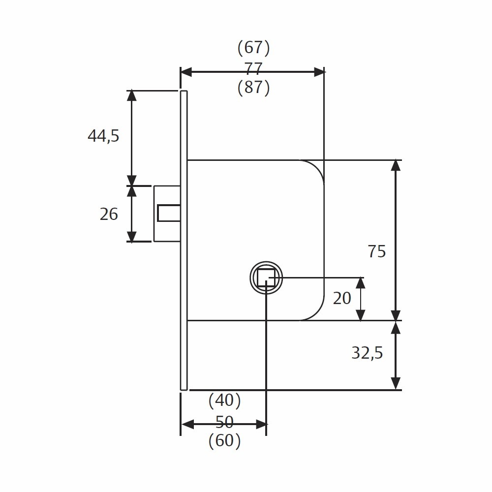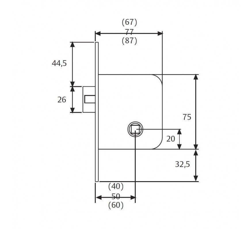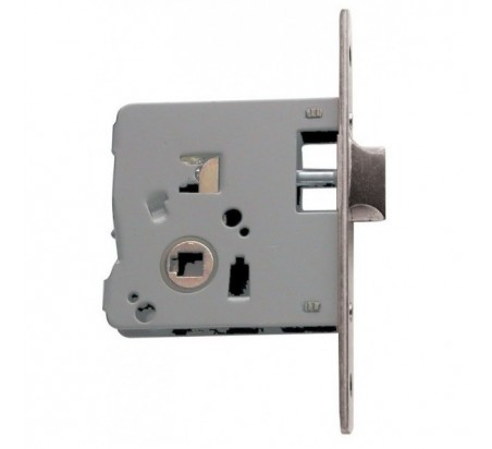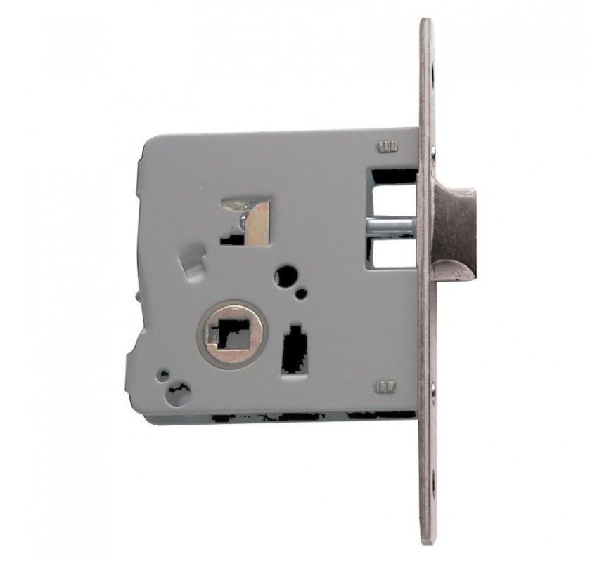 Cerradura de embutir para puertas de madera con cantos redondos.
