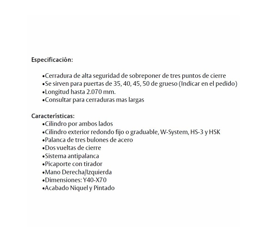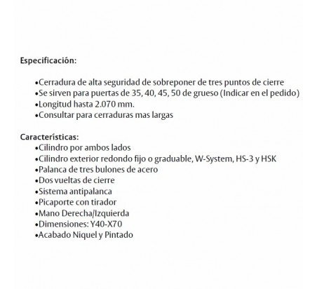 Cerradura de alta seguridad de sobreponer de tres puntos.Longitud hasta 2070 mm. Cilindro por ambos lados. Palanca de tres bulones de acero. Dos vueltas de cierre. Sistema antipalanca. Picaporte con tirador.