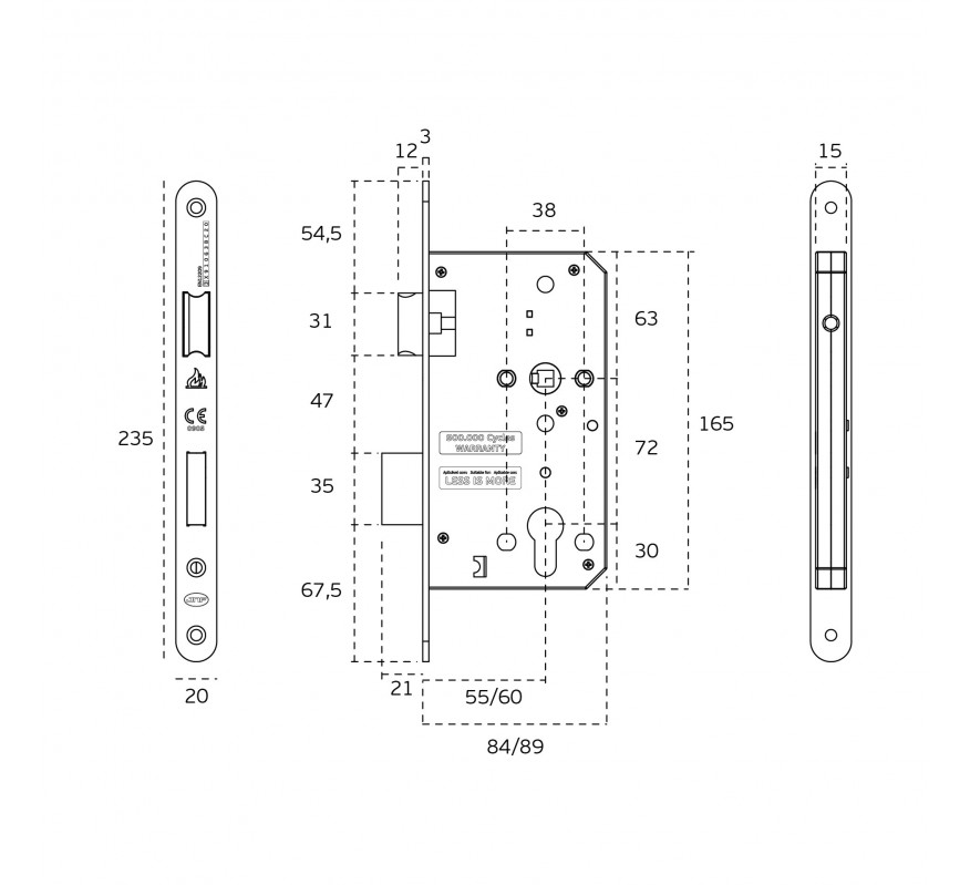 CERRADURA EMBUTIDA GOLPE Y LLAVE IN.20.975 JNF : ACABADOS:INOX MATE AISI, AGUJA:55 mm