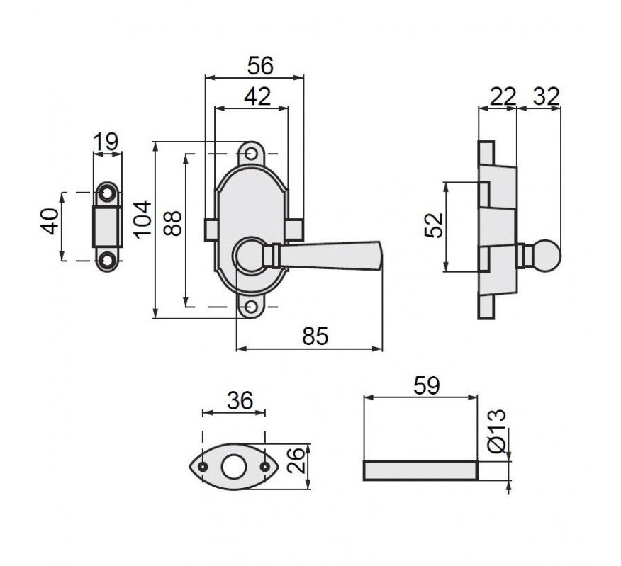 Picaporte resbalón de sobreponer con manilla para puerta de paso.