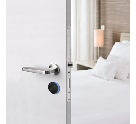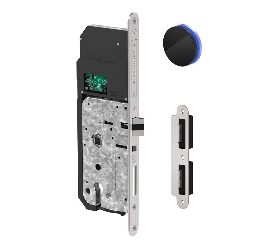 El sistema SKY combina tecnología mecánica y electrónica en una cerradura de embutir, mostrando únicamente la manilla y el lector de tarjetas. Con una instalación simplificada, se monta como una cerradura de embutir tradicional. Autoalimentado con pilas AAA, no requiere conexión eléctrica en la puerta y es compatible con cualquier modelo de manilla JNF.