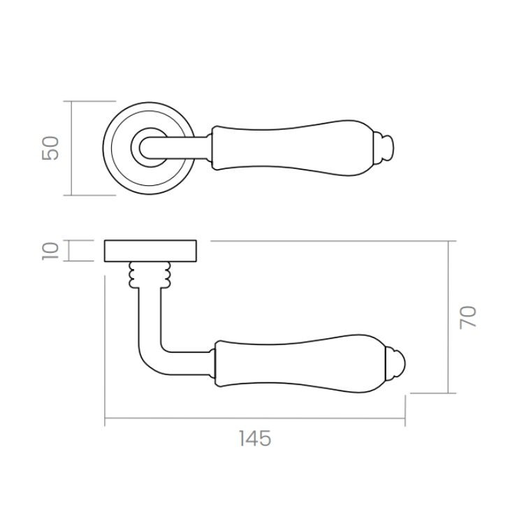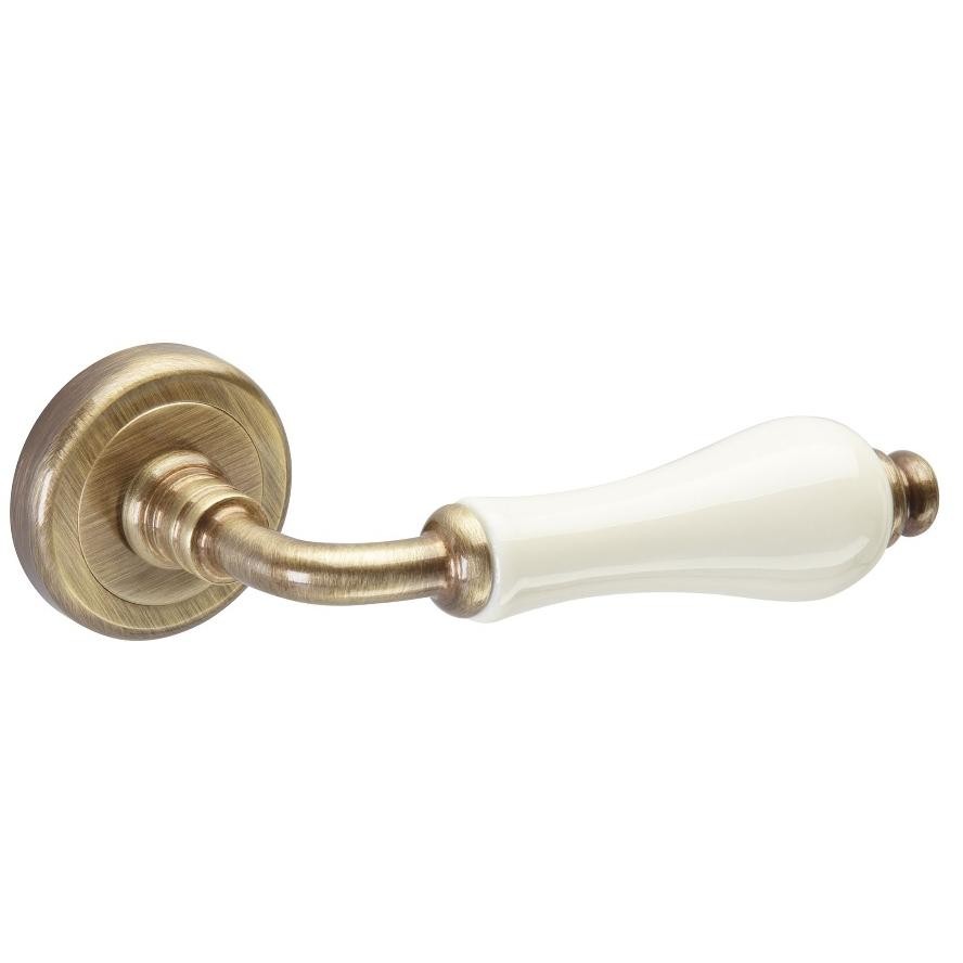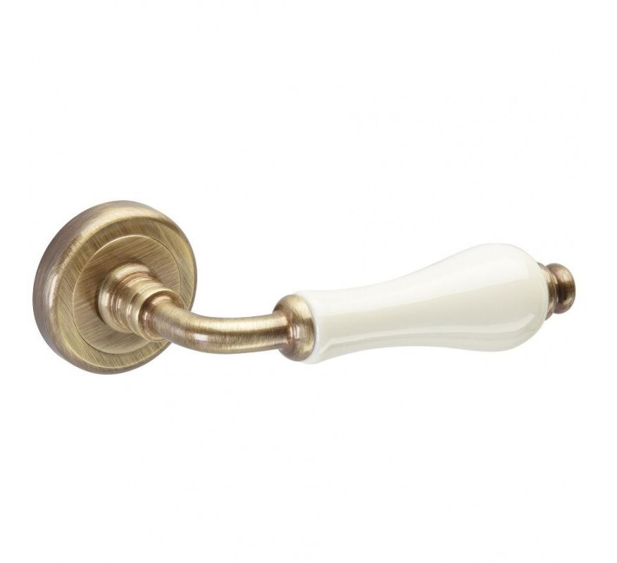 Juego de manillas para puerta de paso fabricada en latón estampado y una empuñadura de porcelana.