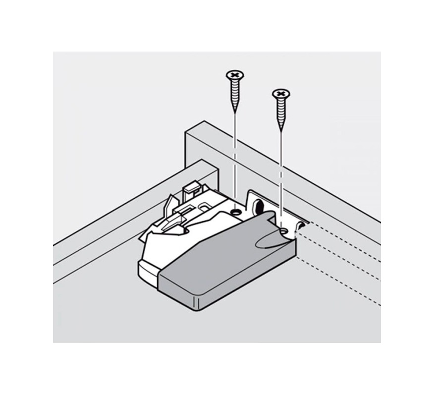 Fijación frontal para guías correderas de la colección Tandem de BLUM. Cada juego de guías requiere dos fijaciones, una para cada lado.